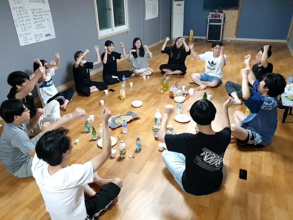 어느새 시간은 11시를 훌쩍 넘기고 노래방 기계도 이제 지친 (남은 시간 000) 띄우며 이상은 안된다는 힘겨운노이즈를 뱉어내고진짜들의 시간이 다가왔습니다. 아무 말없이, 다들 알고 있다는 냉장고에서 꺼내진 페트병들의목이 따이고 과자봉지의 배를 갈라 내장을 꺼내며 의식을 하는 둥그런 원을 만들고 주위에 둘러앉은 우리는 비장한 태도로이중 모션을 시작했습니다. 가뜩이나 이번 코로나 사태로 인해 제대로 대학교 술게임 한번 경험해보지 못한 20학번 회원들과 함께 진행하니 저도 1학년 생각이 나며 막판에는 다들 불타올라서 템포를 높여가며 허벅지를 때려가며 붉게 달아오를 때까지 몰두한 같습니다.
