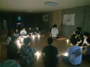 든든하게 배를 채운 우리들은 나머지 남은 중요한 일정들을 진행하기 위해 후다닥 뒷정리를 마치고 펜션 안으로 들어왔습니다. 108기와 109기들이 쑥덕거리는 소리를 들어보니 드디어 벽에 붙어있던 의문의 돼지 머리를 사용할 때가 온듯 합니다. 그런데 이상하게도 불이 꺼지더니 다들 핸드폰 조명을 켜고 모양으로 둘러 앉더니 실시간으로 심각한 분위기가조성되었습니다. 순간 머리속에서는 이게 그동안 없었던 사암의 어두운 면인건가? 사이비 종교 집회에서 갈라져나온 토론 동아리였던가? 하는 말도안되는 생각들이 들었지만 그것은 순전히 저의 착각, 어느덧 차례가 쯤에는진지하게 한학기에 대한 회고와 앞으로 남은 두학기에 대한 기원을 하고 있었습니다.
