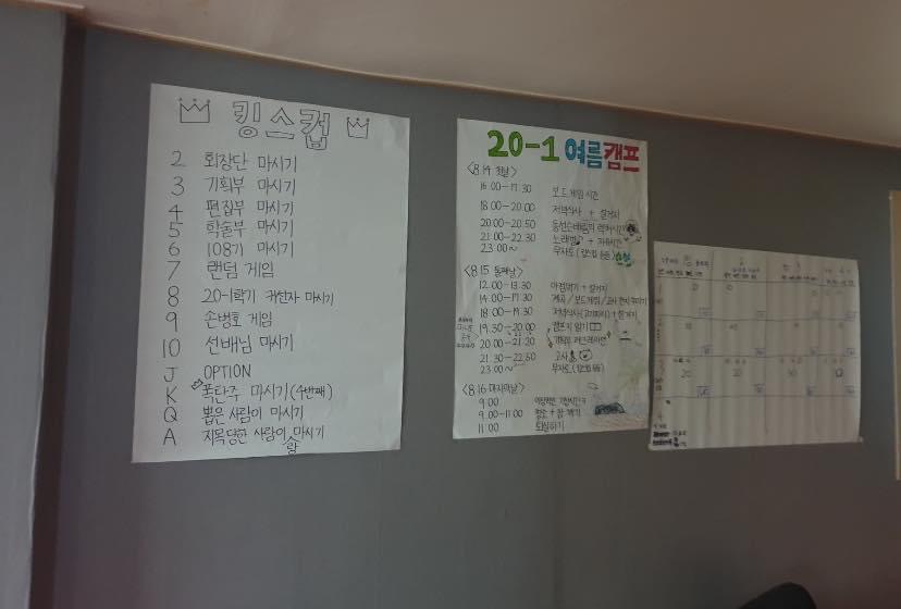 훈훈해진 마음을 다들 가슴속에 품은 채로 대형을 유지한 어제부터 기다려온 일정이죠, 개봉박두! 캠프 저부터 모두가솜씨를 발휘해 적어놓은 캠프지에서 과연 누가 어떤 원고를 제출한 맞춰보며 서로에 대해 얼마나 파악하고 있는지알아보는 시간을 가졌습니다. 개인적으로 저는 110 손형동씨의 시가 가장 기억에 남는 같습니다^^ (만약 만나게 된다면 본인에게 물어보세요!) 2일차에 일정을 집중해서 소화하다보니 밤이 깊어가지만 단체 레크리에이션은 빼놓을 없는것이 인지상정! 기획부장 승아와 윤선이 그리고 일일 도우미를 자청한 편집부장 지현이까지 합류해서 팀별로 댄스배틀, 몸으로 말해요 등의 게임을 통해 잠시나마 불꽃튀는 대결구도였지만 마지막에는 다같이 훈훈하게 사암의 노래를 부르며 마무리되었습니다. 어제 밤에 다들 너무 달린 탓인지 벌써부터 탈주자들이 속출하는 가운데 사암만의 독특한 술자리 게임! 킹스컵을 드디어 맛볼 있는 기회가 찾아왔습니다. 트럼프 카드를 돌아가며 뒤집은 숫자에 따라 벌주를 마시는 식이었는데요. 인간의 욕심은 끝이 없고 실수를 반복한다는 말이 있듯이 쭉쭉 들이키다 보니 시간가는줄도 모르고 이틀차 또한 깊어가고 있었습니다.