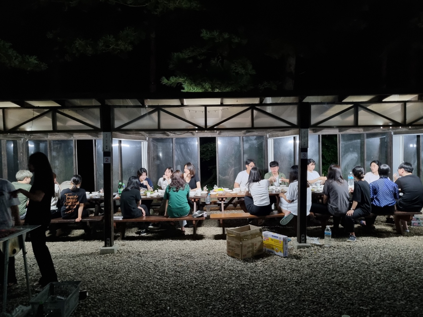 천진난만하게 놀고 나니 잊고 있던 허기가 찾아왔다. 캠프와 MT의 꽃, 바베큐! 사실 처음 세팅을 도와줄 당시, ‘운위들이 이번에 돈이 좀 많이 남았나’ 라는 의문이 들 정도로 고기가 많길래 당황했지만 당황한 기색을 숨기고 바베큐를 진행했는데, 고기를 굽기 시작한 지 10분? 15분 만에 내가 괜한 생각을 했구나 싶었다. 역시 우리 먹짱 사암인들..아직도 키가 크려는지 쑥쑥 잘 먹는 모습을 보고 있으니 불 앞에서 고기를 굽는데 더운 것보다 뿌듯함이 더 컸다. 모두가 고기 굽는 우리를 안타깝게 바라봤지만 계곡을 등지고 자갈 위, 불 앞에서 막 익은 고기를 집게로 집어먹는 게 얼마나 맛있는지 알면 그렇게 안타깝게 바라보진 않았을 텐데 싶을 만큼 진짜 최고의 고기 맛이었다. 불 옆이라 미지근해진 소주가 스테이크 앞에 놓여진 30년은 숙성된 와인이 된 착각이 들 정도의 맛이랄까. 나와 준모형은 다음 날엔 정기로 선배님과 자리를 해야 해서 첫째 날만 구웠지만 이틀 연속으로 묵묵히 고기를 구워준 규은이한테도 고맙다는 말과 리스펙을 전한다. 사실 첨엔 안 믿었지만 진짜 고기 잘 굽더라..인정할게 고잘굽!