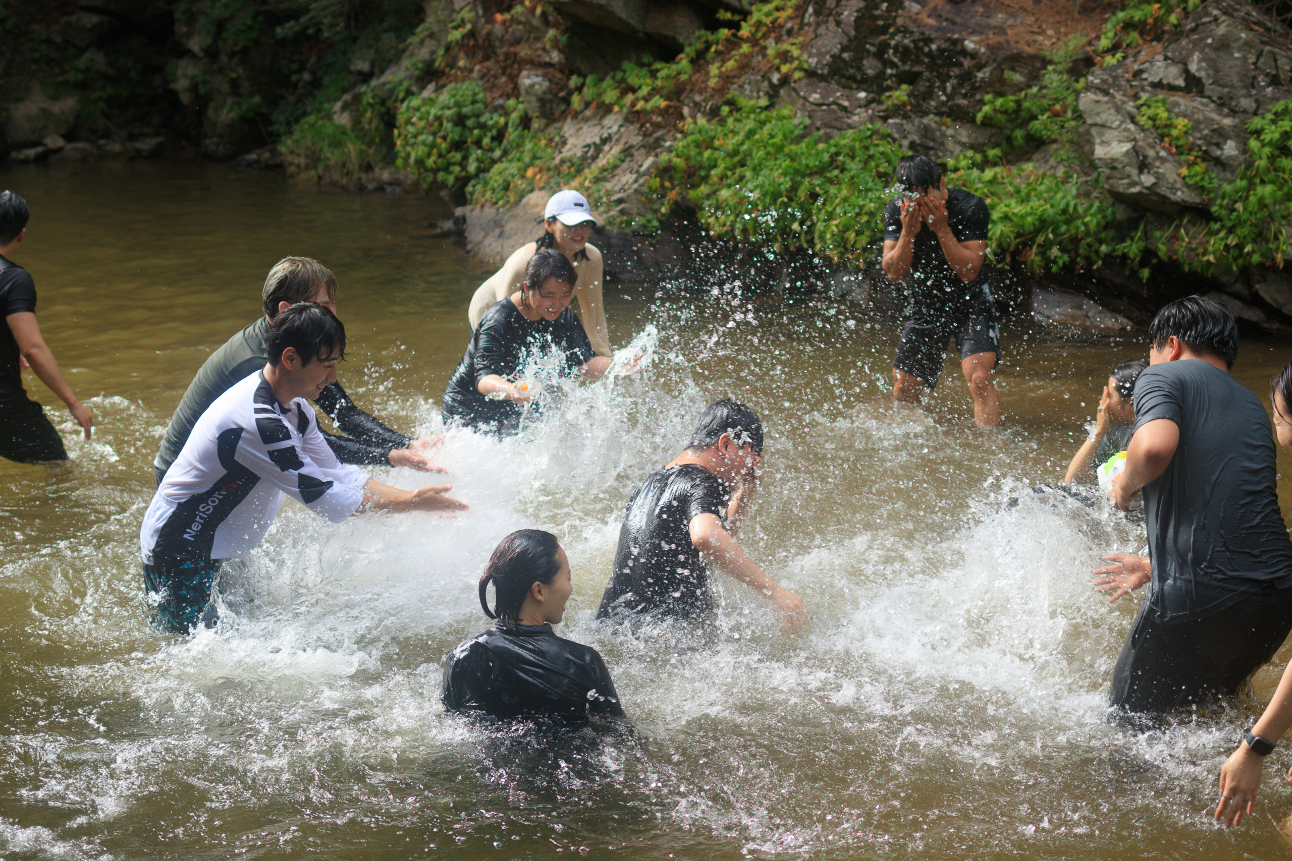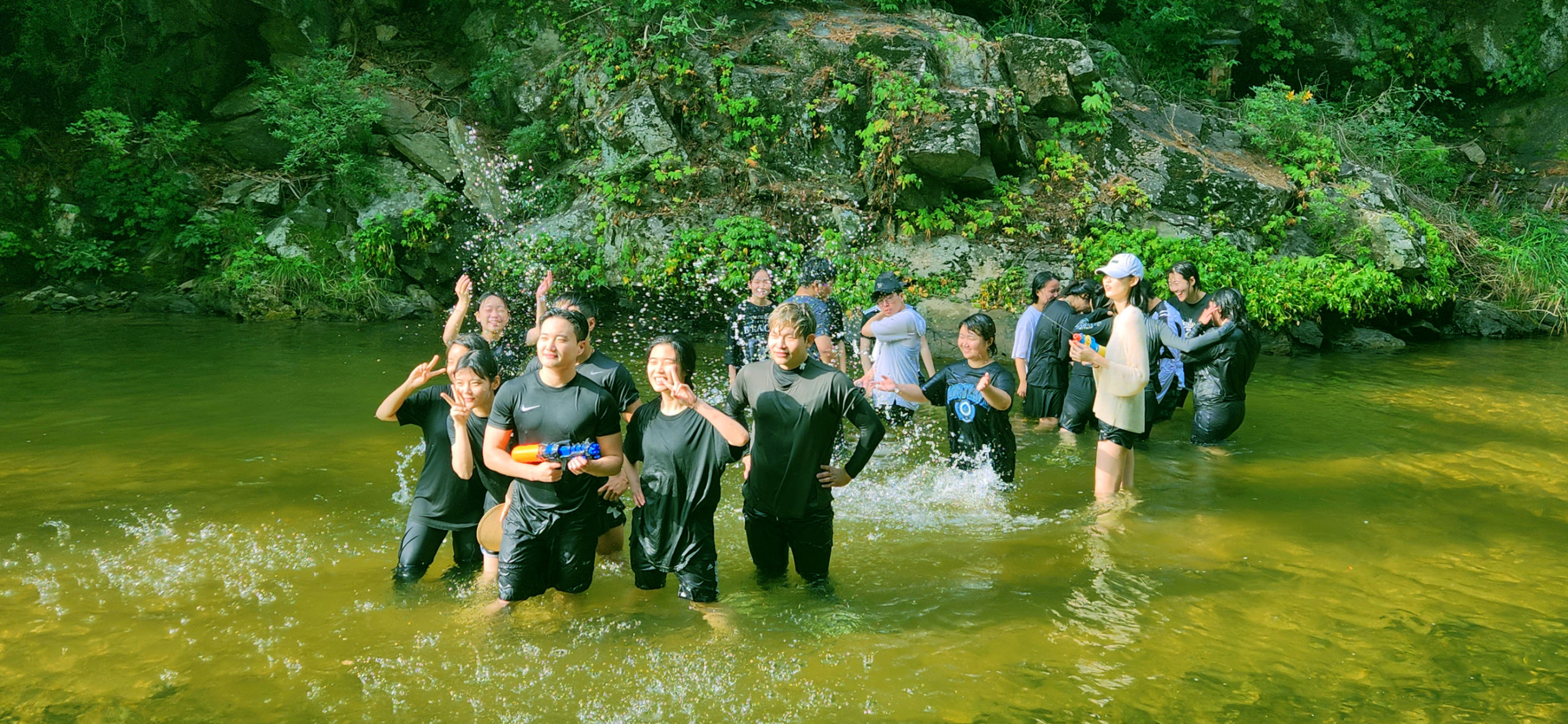 어찌저찌 장을 다 보고 인사를 나누는 시간, 처음 보는 얼굴들도 많았고, 익숙한 얼굴도 있었고, 너무 보고 싶었는데 못 보던 사람도 있었다. 정말 모두가 반가웠고, 그때부터 행복했다. 앞으로 이 사람들이랑 함께라는 생각에 행복할 시간들이 기대돼서 행복해지지 않을 수가 없었다. 그렇게 도착한 홍천 연수원, 두번째 봐도 설렌다. 짐을 풀고 들어간 계곡. 비가 내리고 시간이 좀 지난 다음 가서 그런지 수심은 작년보다 얕아 작년처럼 사람을 던지고 놀진 못했지만, 물이 얕아 던질 수 없다면 뭐, 우리가 물까지 다가가야지. 한 사람씩 엎어서 담그면 그만이다. 처음엔 역시 분위기를 주도하는 회장님, 찬하형 등등을 필두로 한 명씩 담그기 시작하더니 작년과 뭐가 달라졌냐는 듯 시간이 지나니 “뽀송뽀송한 사람 누구야?!”하며 거의 모두가 물에 빠진 생쥐 꼴이 될 때까지 서로를 빠트리며 놀았다. 아직 통성명도 안 한 사람들이 서로를 물에 빠트리고 담글 수 있다는 게 아직도 신기하다.