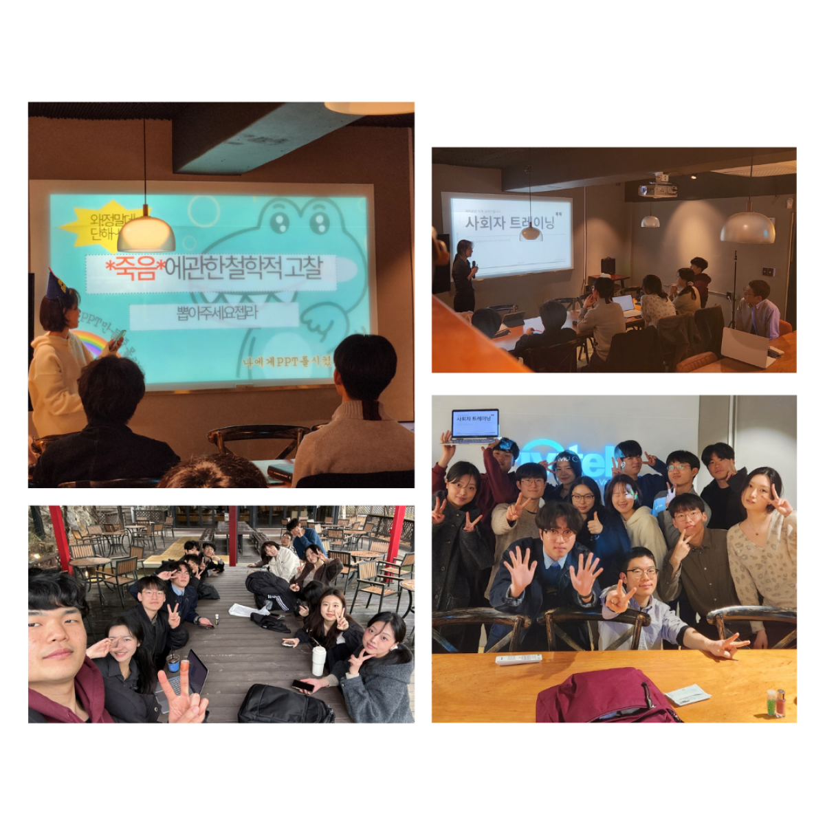안녕하세요 118기 정연우입니다~ 이번 주에는 커선보와 사회자 트레이닝을 진행습니다. 동국대 근처의 공간을 대여해서 진행했는데, 아늑하고 편안한 분위기라 오히려 더 즐겁게 활동 할 수 있었던 것 같습니다! 다들 열정적으로 커선보를 진행해 주셨고 모두 굉장히 재밌었습니다. 저는 이번에도 피피티를 준비하지 않았는데 준비할걸 그랬나.. 약간 후회가 되네요. 118기는 마지막 커선보인만큼 후련하기도하고 아쉽기도 하고 복잡한 마음이네요~ 이번에는 처음으로 영화 커리라는 것을 도입해 선택적으로 영화 작품을 가져왔습니다. 생각보다 많은 분들이 영화를 가져와 주셔서 정말 재미있게 이야기 들었습니다. 모두 재미있는 작품들 가지고 와서 새롭고 즐거웠던 시간이었어요!